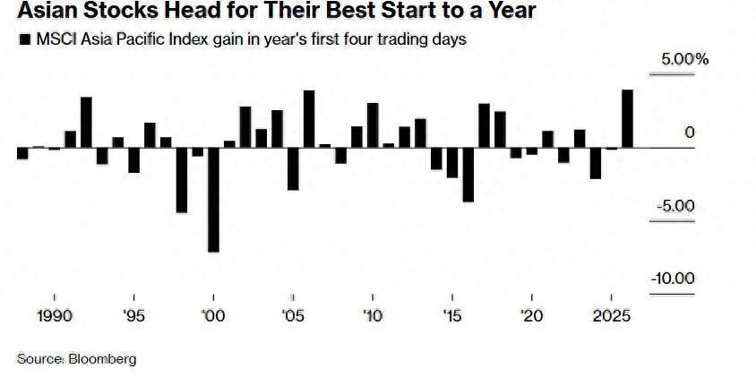 智通财经APP获悉,亚洲股市堪称2026年开年全球最强股票市场——迎来史上最佳年度开局表现,随着投资者们在估值高企的美国股票市场之外积极寻找投资机遇,尤其是与AI投资主题密切相关联的投资机遇聚宝盆,该地区的主权货币与主权债券价格也一同上涨。